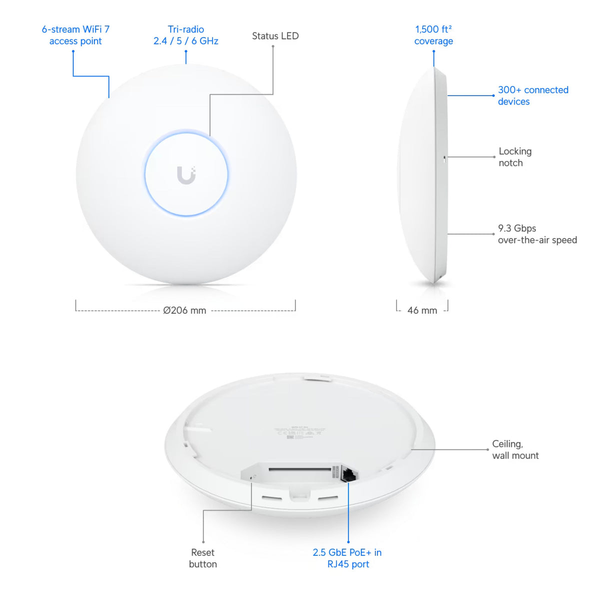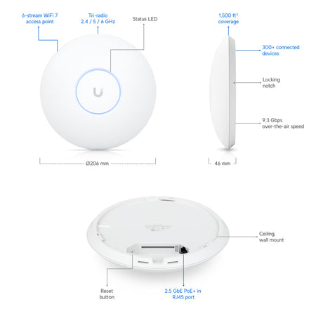 The Ubiquiti U7 Pro Access Point [U7-Pro-US] is a eiling-mounted WiFi 7 AP with 6 spatial streams and 6 GHz support for interference-free WiFi in demanding, large-scale environments.